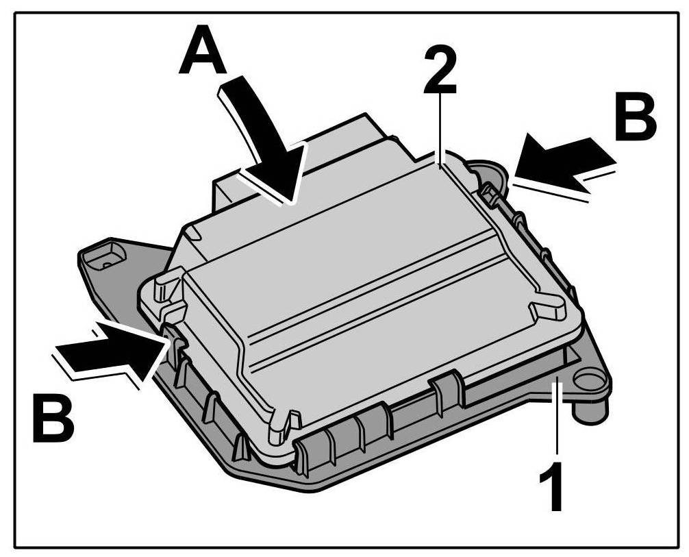 1. Slide control unit for rear-differential lock -2- fully into the holder -1- and press it in -arrow A- until the two clips -arrows B- engage securely.