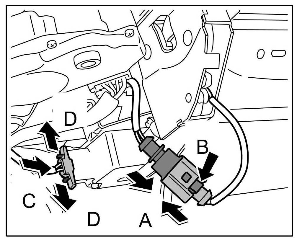3. Push in connector -arrow C- until the locking tabs -arrows D- are felt to engage.