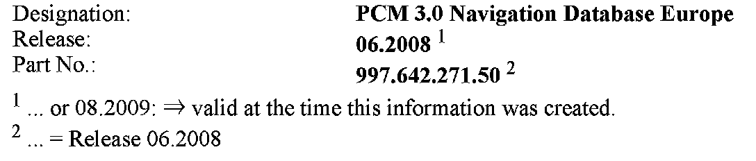 The navigation data record stored in PCM has an 11-digit software number, which can be displayed using the PIWIS Tester and PIWIS information system. The software number gives an indication of how up-to-date the data record is. It is not a part number that can be used for ordering spare parts. PIWIS Tester: --> 'PCM 3.0' --> 'Navigation' --> 'Identification'.