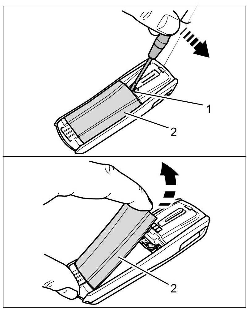 1. Insert a small screwdriver into the opening -1- on the back of the additional handset and carefully prise off the cover -2-.