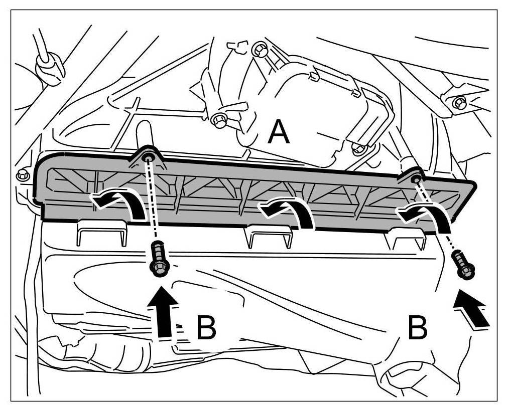 2. Engage cover -A- and screw in the fastening screws -arrows B-.