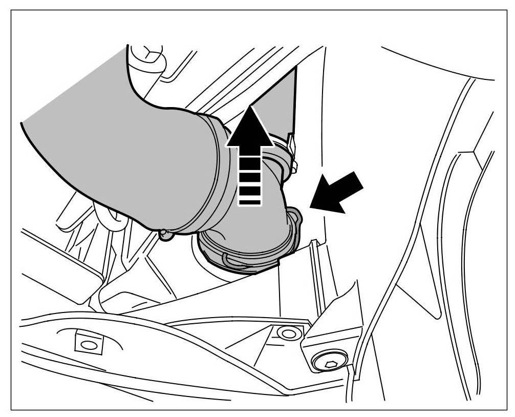 6. Disconnect intake pipe for the engine. To do this, remove locking clip -arrow- and pull off the line.