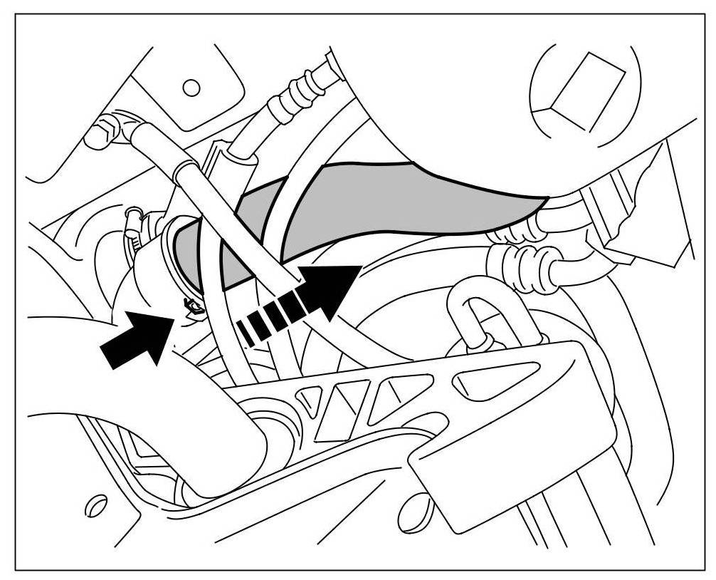 13. Fit intake pipe for engine. To do this, insert the locking clip -arrow- and push line on until it engages.