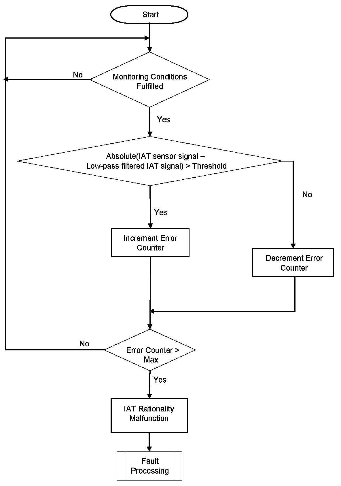 This diagnosis checks IAT for a Stuck signal. If the vehicle was driven for a mini-mum required distance and time-after-start, then the change in the IAT signal during this period should be above a calibrate able threshold. If this is not the case, a stuck IAT signal is detected.