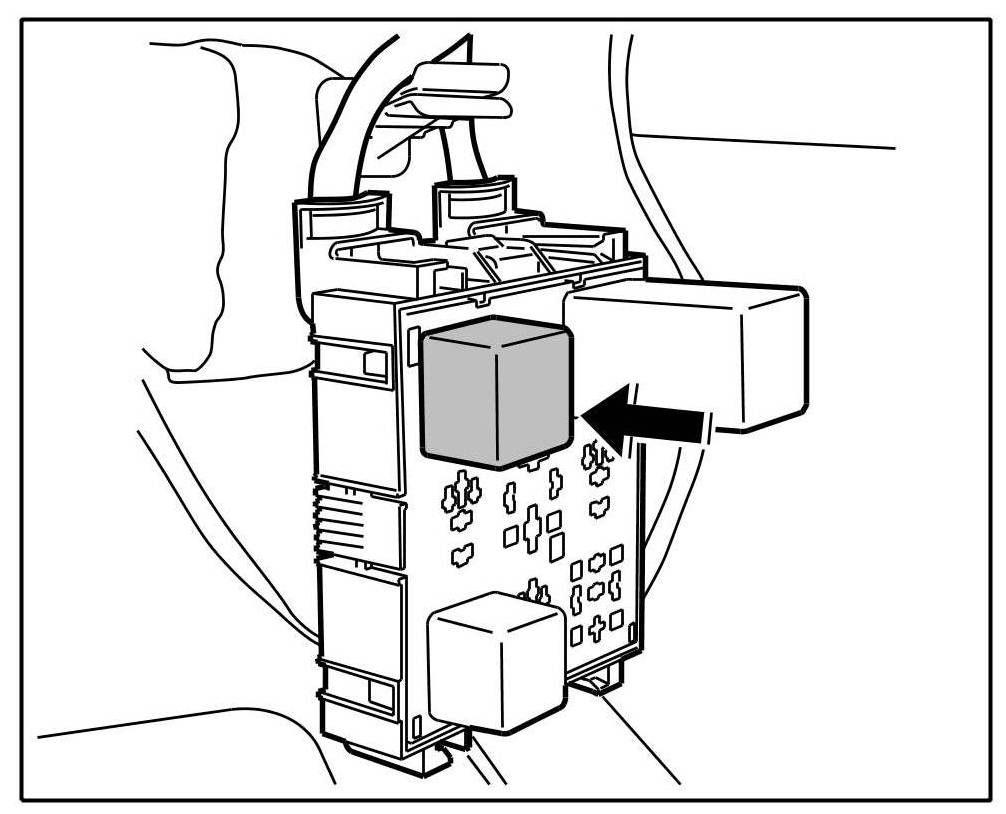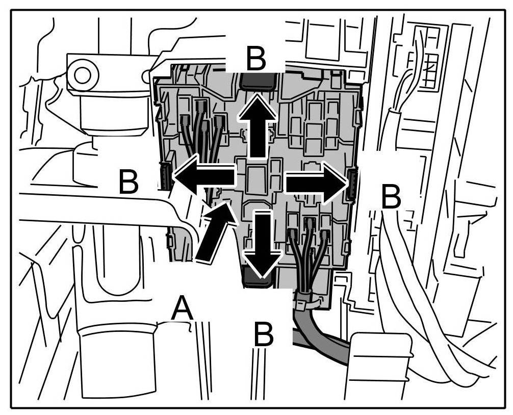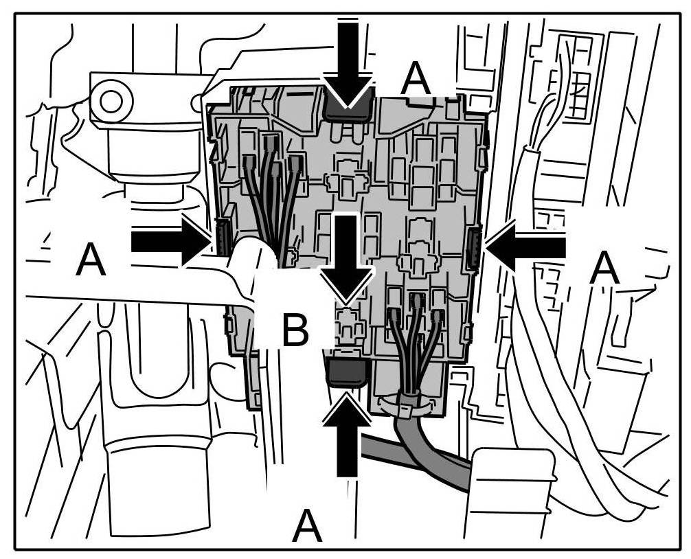 1. Release the relay carrier -arrows A- and pull it down and out -arrow B-.