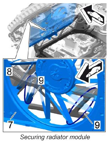 1. Secure radiator module -7- with tie-wraps -9- to the subframe -8- .