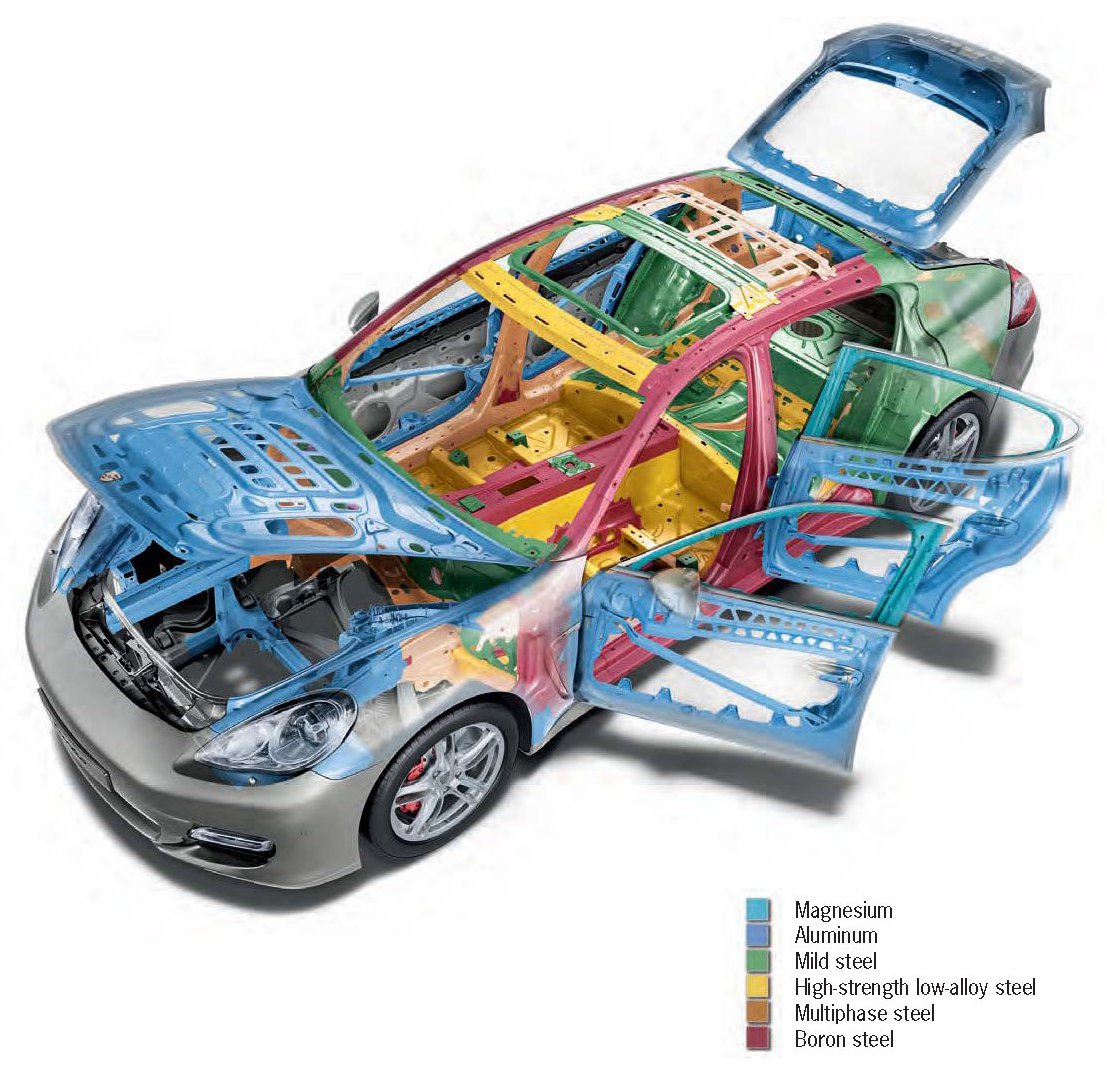 The Panamera body shell is a hybrid structure, which is made up of several grades of advanced high-strength steels, stainless steel, aluminum and magnesium.