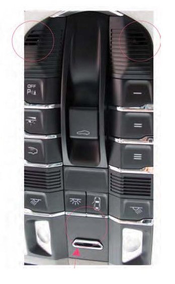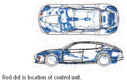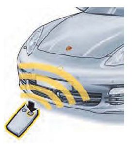 The Panamera features a Home Link system that actuates the garage door drive, gate to property, alarm system or door locking. The programmed function is activated by pressing the relevant button in the keypad of the roof console. The garage door opener used in North America assigned frequency range 288 MHz - 418 MHz.
