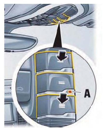 This process deletes the standard factory-set codes. Do not repeat this process if you want to assign additional signals to the buttons. Keep the two outer buttons (arrows in above illustration) on the overhead operating console pressed down for approx. 20 seconds until indicator light A on the button begins to flash quickly.