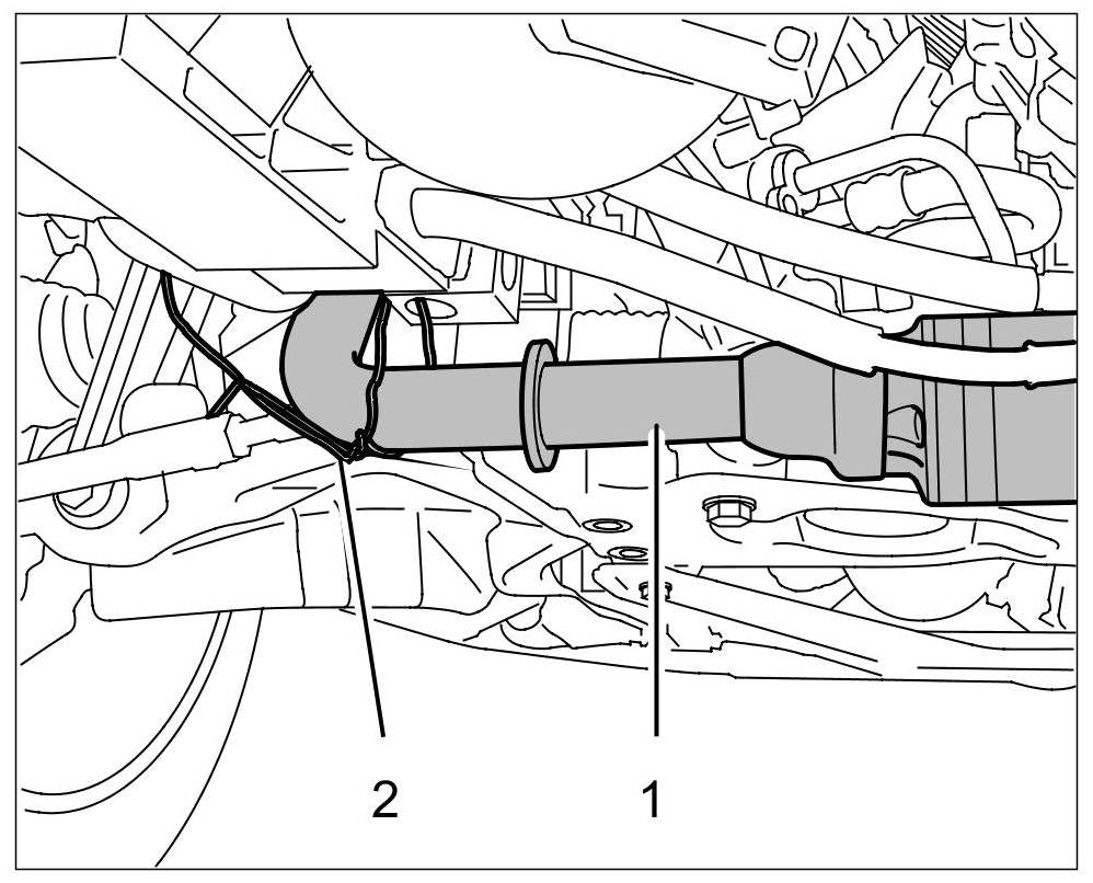 5. Tie anti-roll bar -1- to the body using a suitable piece of wire -2- to prevent any load on the steel flexi-pipes.