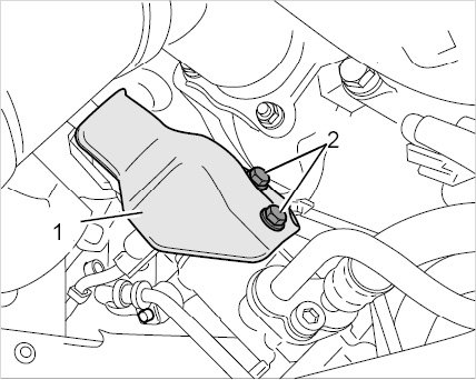 6. Fit heat protection panel -1- between the universal joint for the steering gear and the primary catalytic converter.