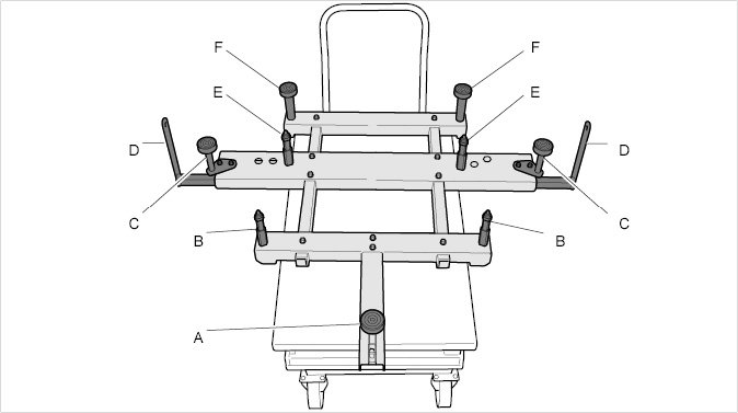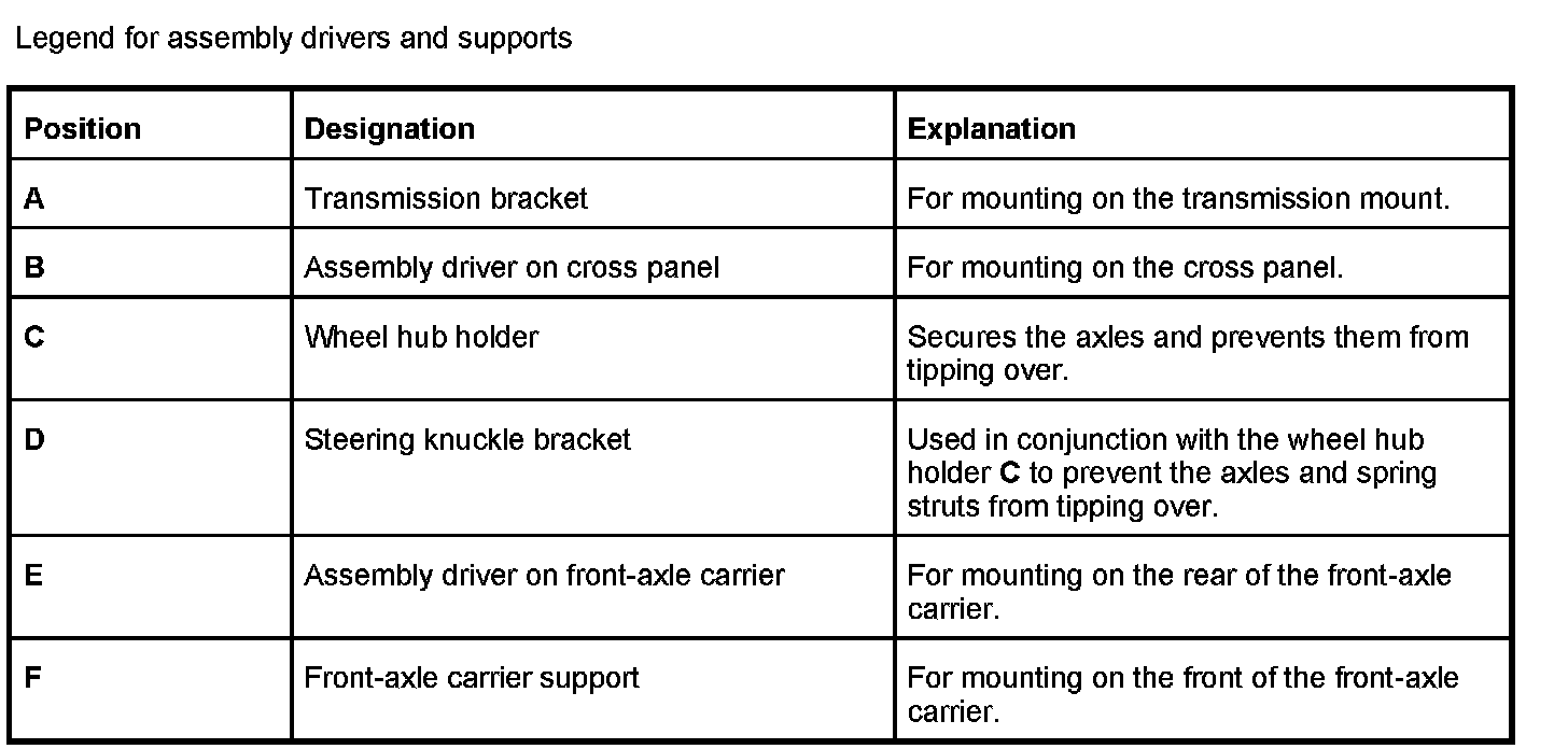 11. Place elevating platform Master Gear unit elevating platform WE 1206 under the vehicle and move all assembly drivers -A, B, C, D, E, F- to the same height at the correct position.