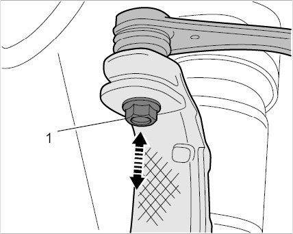 13. Loosen fastening nuts -1- on the lower control arm at both sides (do not remove the bolts yet!).