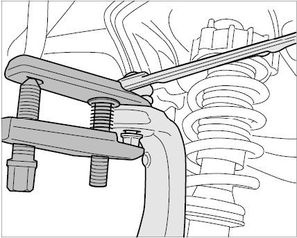 10.2. Press off the ball joint using the ball joint puller T40010. When doing this, leave the fastening nut flush on the ball pin so as not to damage the thread.