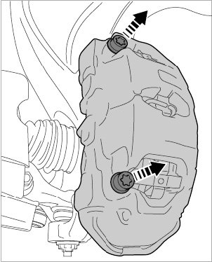 12. Remove brake caliper at the left/right, but do not remove the brake line (Do not open the brake system!).