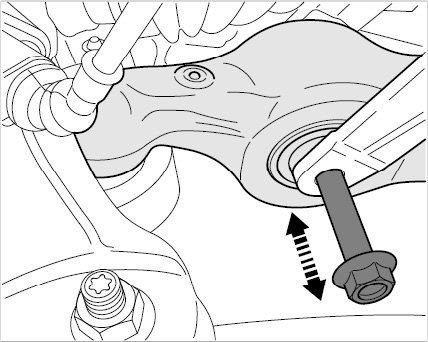 14.2. Pull out bolt on the lower control arm at the left and right -direction arrow-.