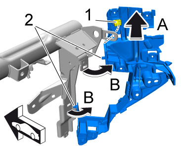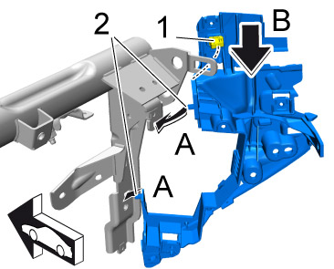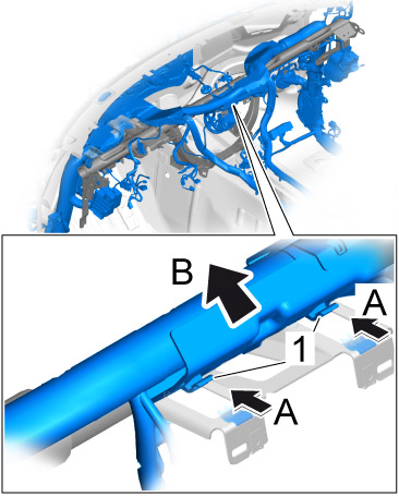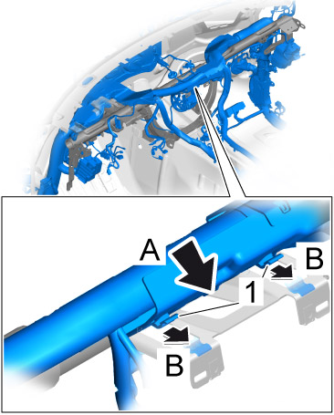 1. Move dashboard support -1- into the passenger compartment from the driver's seat -arrow A- and guide it into the wire harness -2-.