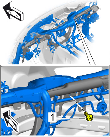 5. Unscrew and remove fastening screws -1- on the cable duct at the passenger's side.
