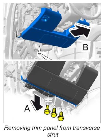 4. Unscrew and remove fastening screws on the transverse strut -arrow A- and pull the trim panel forward towards the driver's seat -arrow B- .
