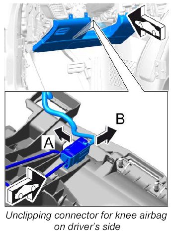 6. Release connector for knee airbag -arrow A- and pull it off -arrow B- .