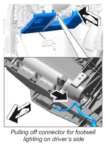 7. Pull off connector for footwell lighting -arrow- .