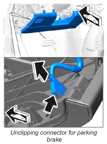 8. Release and pull off connector for parking brake -arrow- .