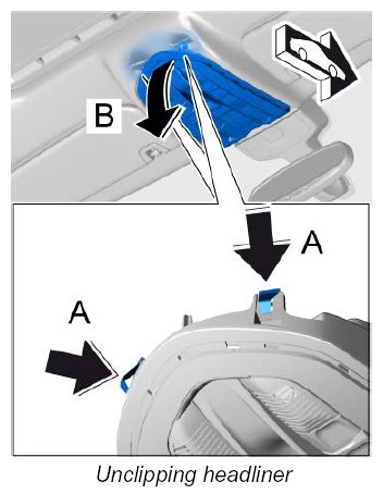 3. Unclip headliner at the two side cut-outs -A- and swivel it downwards -B- .