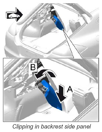 2. Clip in backrest side panel -A- and swivel it into position -B- .