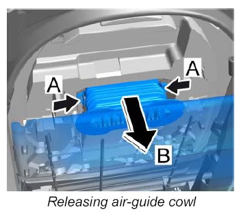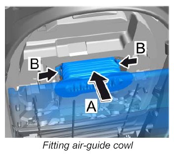 Guide in -B- and lock -A- the air-guide cowl for seat ventilation on both sides.