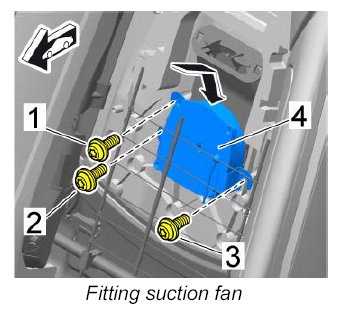 1. Guide the suction fan -4- in from above -arrow- and fit the three fastening screws -1, 2, 3- .
