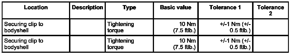 - Tightening torque: 10 Nm (7.5 ftlb.)±1 Nm (±0.5 ftlb.).