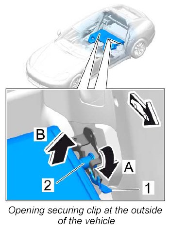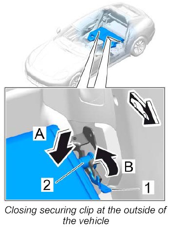 3. Close the securing clip -1- at the outside of the vehicle -arrow B- .