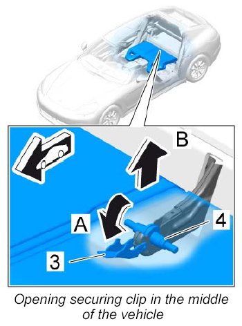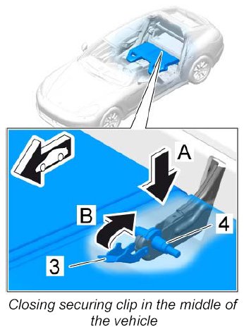 2. Close the securing clip -3- in the middle of the vehicle -arrow B- .