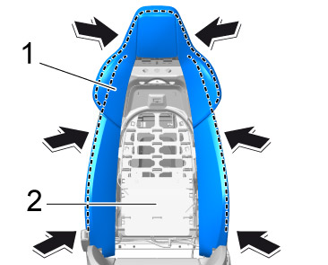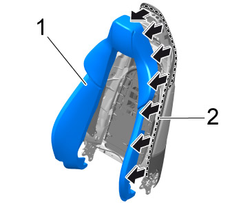 2. Place padding -1- on the backrest frame -2- and straighten it -arrows-.