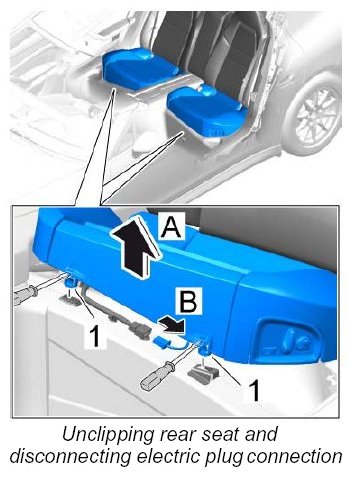 3. Lift the rear seat up slightly -arrow A- and release and disconnect the electric plug connection -arrow B- .
