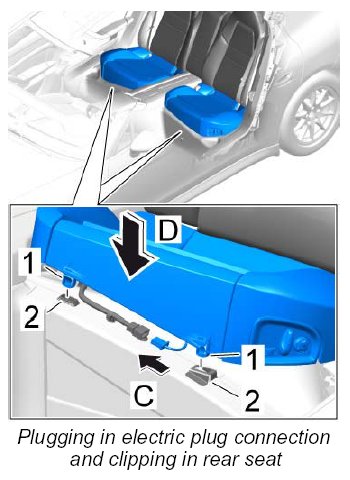 3. Position the rear seat -arrow D- and clip the locking lugs -1- for the rear seat into the clips -2- until they engage securely.