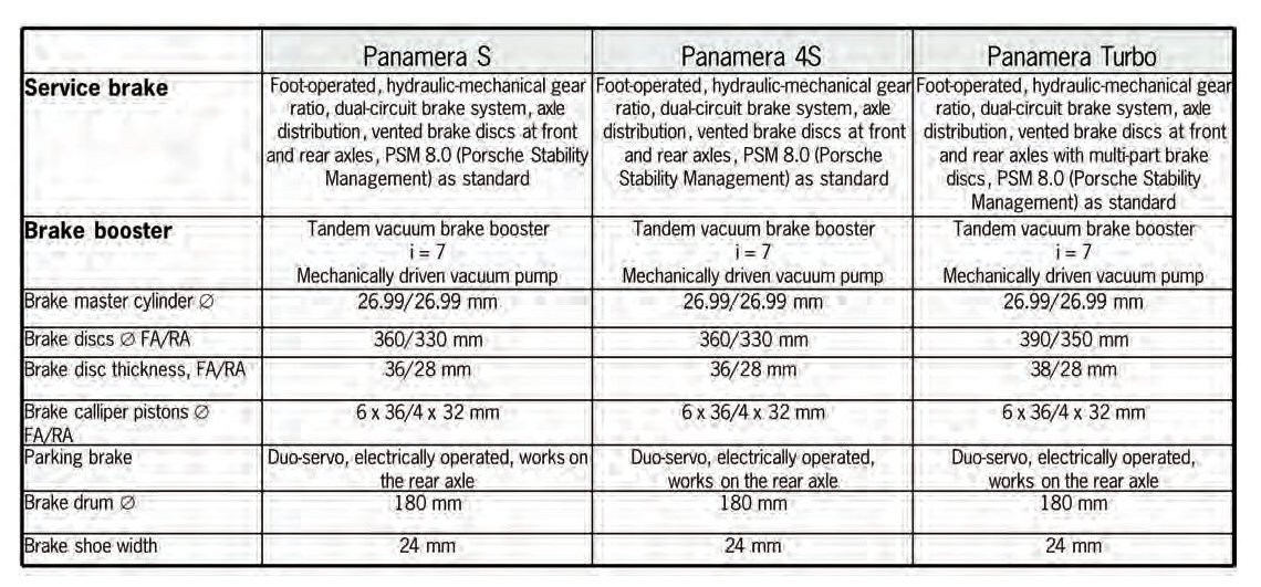 For the Panamera S and Panamera 4S models, this brake system is designed with a brake disc diameter of 390 mm at the front and 350 mm at the rear, while the system used on the Panamera Turbo has a brake disc diameter of 410 mm at the front and 350 mm at the rear. 6-piston aluminum monobloc fixed caliper brakes are also used here on the front axle and 4-piston aluminum monobloc fixed caliper brakes on the rear axle of all Panamera models.