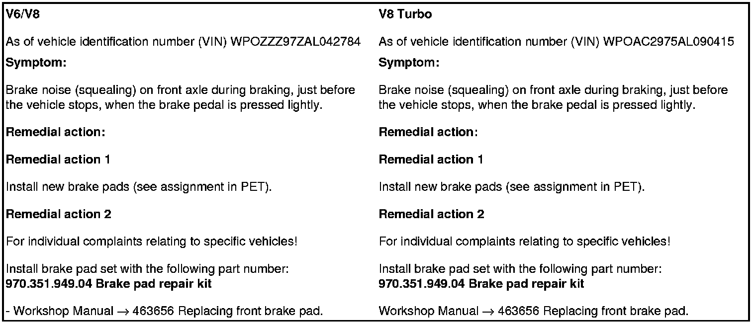 - General recommendation in the event of a complaint: Install new brake pads (current spare parts) (Refer to assignment in the Porsche Electronic Parts Catalogue (PET) and follow instructions in the repair information).