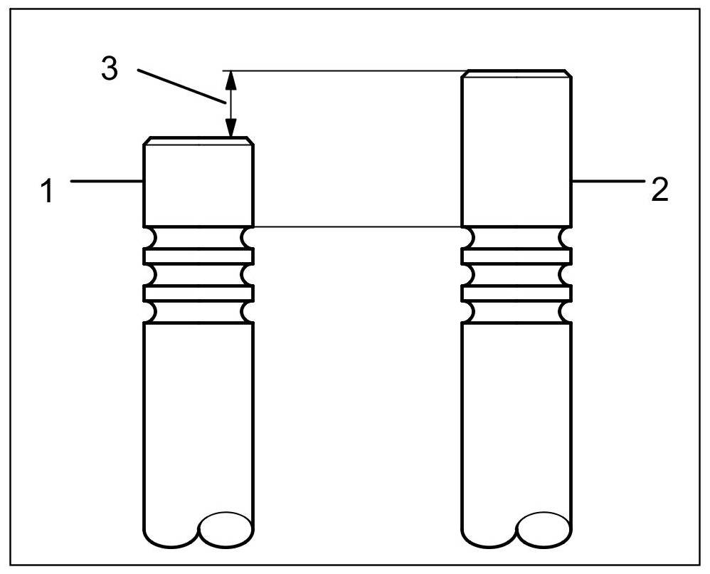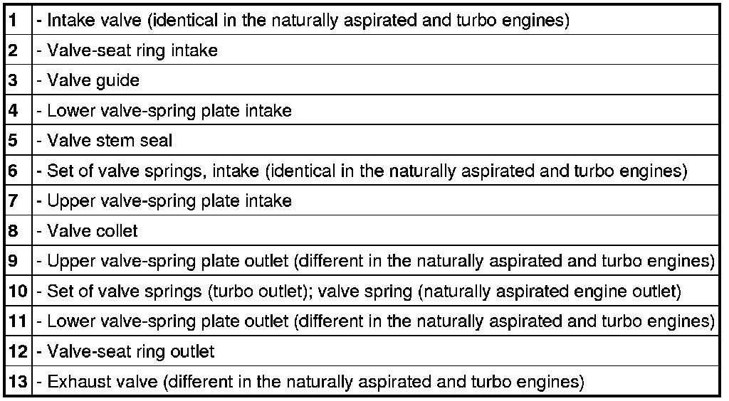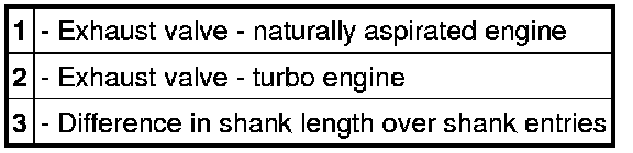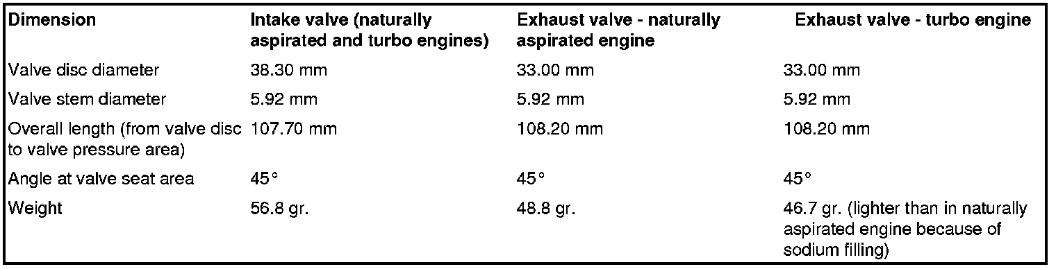 In the Turbo, the exhaust valve is fitted with internal and external valve springs (set of valve springs) and adapted concave washers. The exhaust valve in the turbo engine has the same outer dimensions as the exhaust valve of the naturally aspirated engine. However, because of the sodium filling, the exhaust valve in the turbo engine is lighter and the shank over the shank entries is longer. For further details, please see Figures and Table entitled "Valve dimensions".