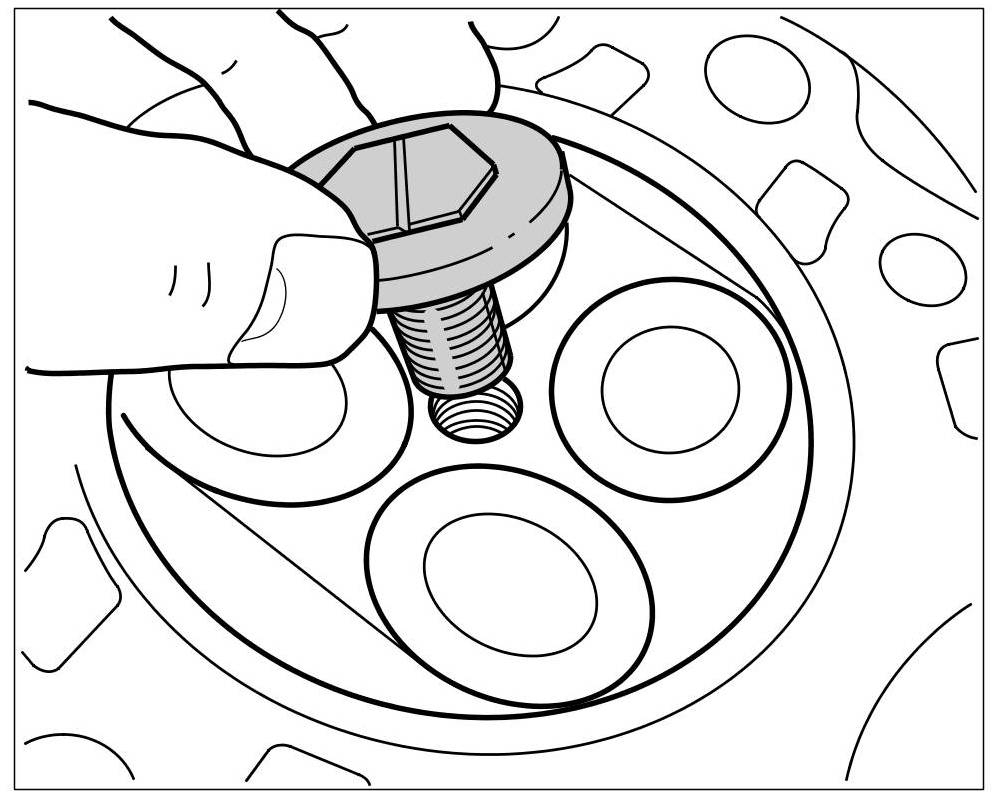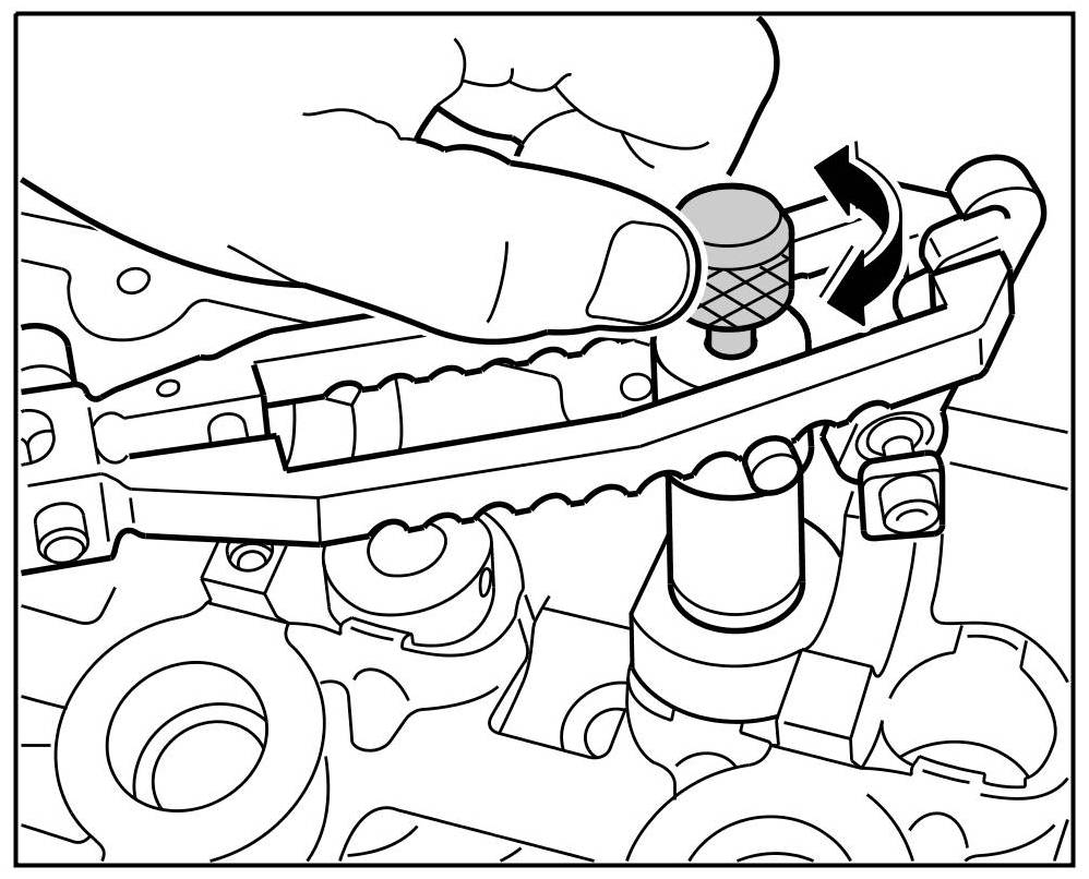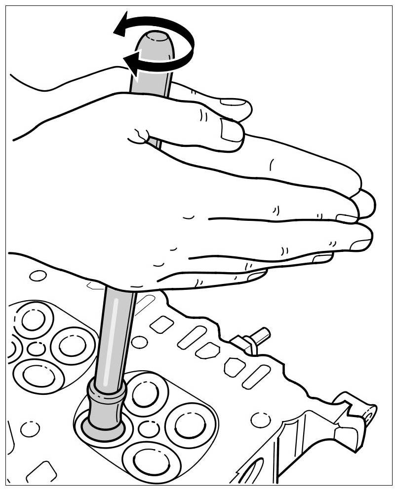 10. Press the assembly cartridge down against the valve spring force using a lever (assembly fork) and keep it pressed. The knurled screw moves forward. Turn the knurled screw back and forward until the valve keys engage => Installing valve keys. Repeat this several times if necessary.