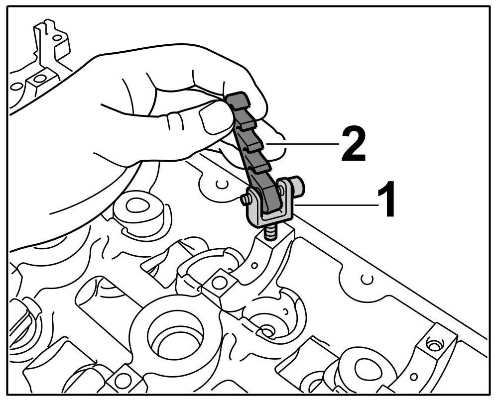 2.1. Screw a holder -1- with a suitable thread into the matching thread on the cylinder head. The hook -2- is pre-fitted in the holder.