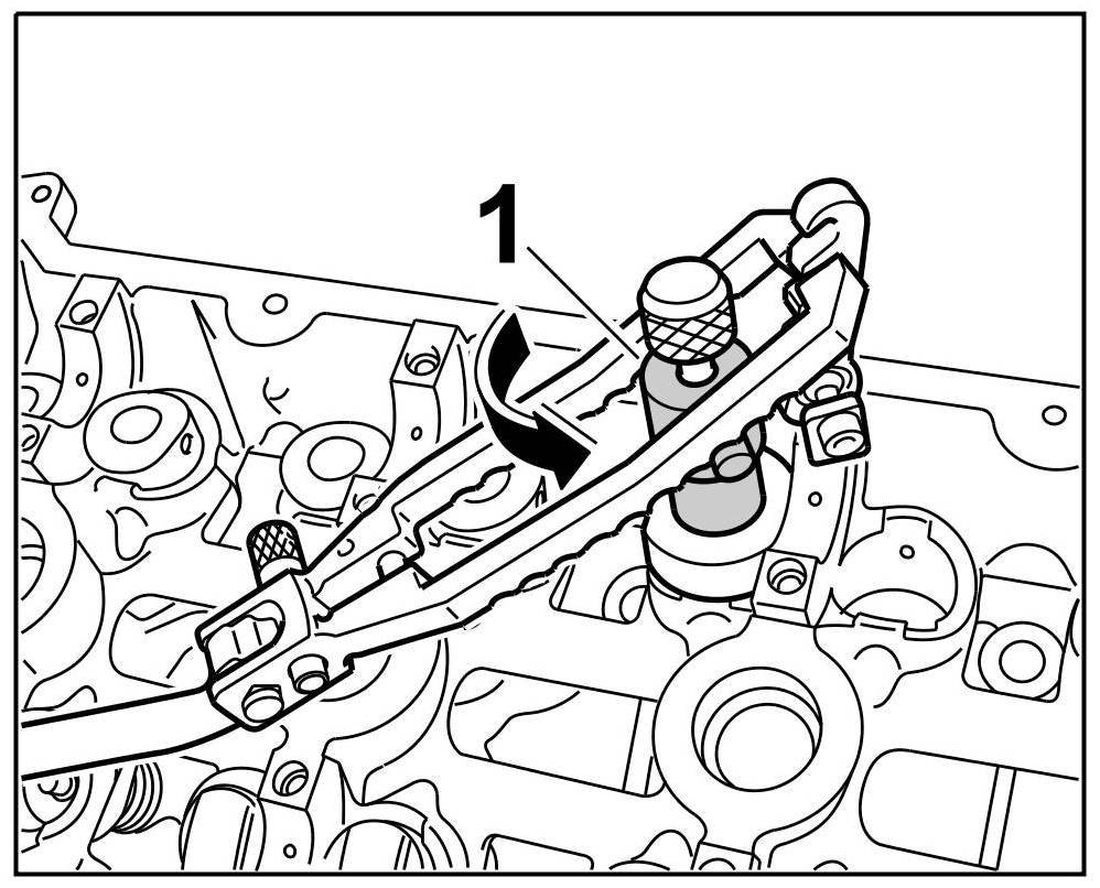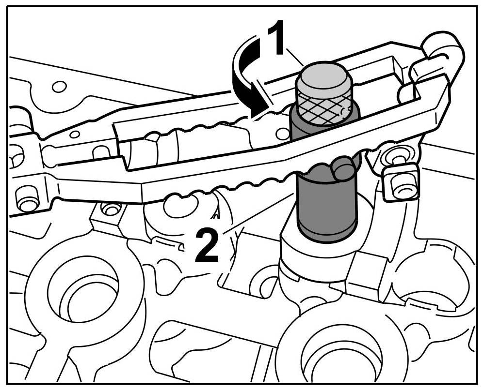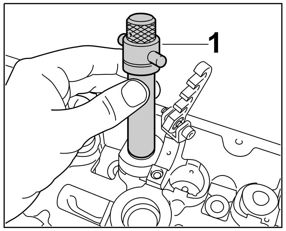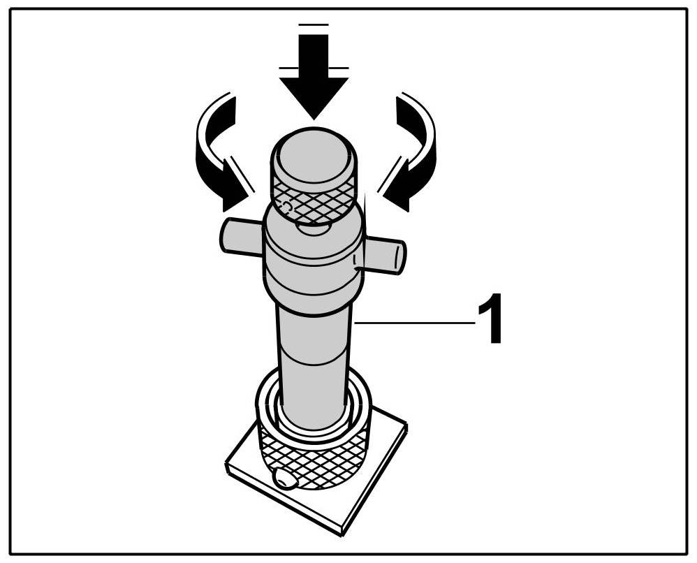3.1. Press the assembly cartridge down against the valve spring force using a lever (assembly fork) and keep it pressed => Pressing down tool. The knurled screw on the assembly cartridge moves forward -1-.