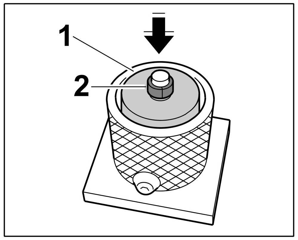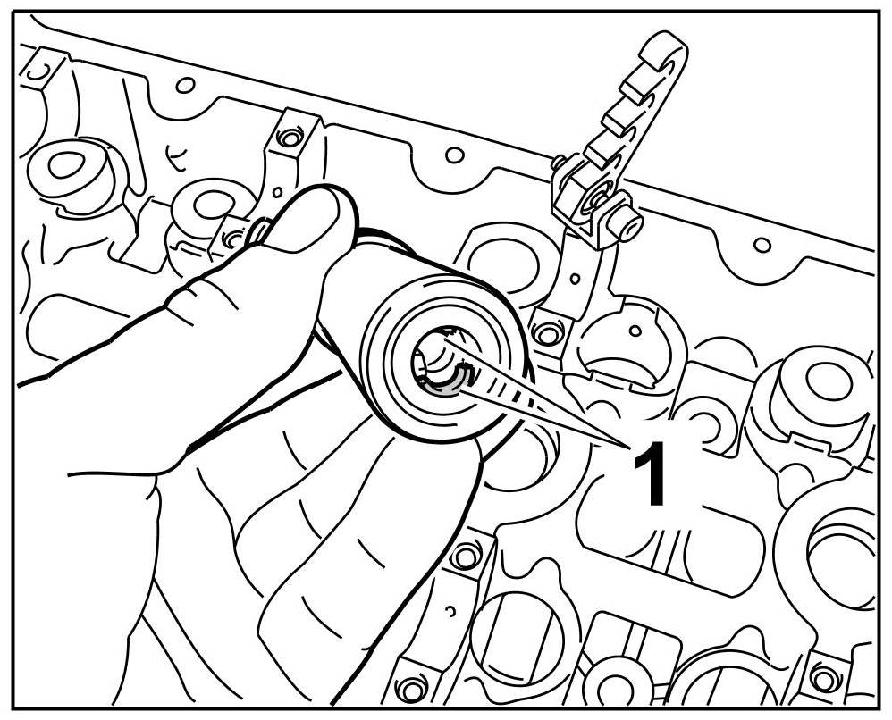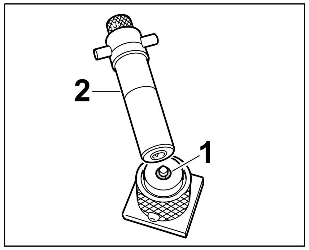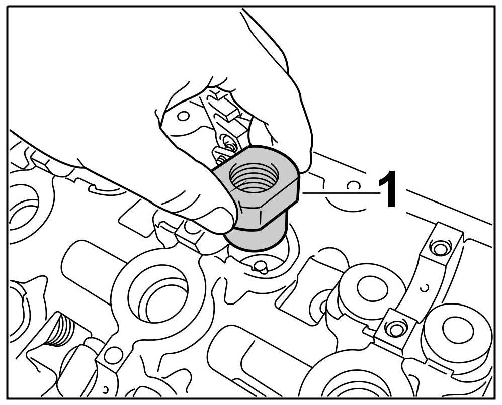 3.1. Press the assembly cartridge down against the valve spring force using a lever (assembly fork) and keep it pressed => Pressing down tool. The knurled screw on the assembly cartridge moves forward -1-.