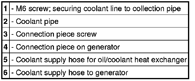19. Remove metal pipe for coolant supply -2-. Remove coolant hoses and metal pipe -5 and 6-.