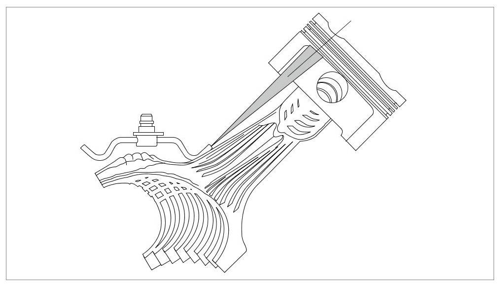 Insert oil spray jets into the upper part of the crankcase and screw them on. To do this, grease the sealing ring sparingly with Kluber Syntheso GLEP 1 and fit it. Check that oil spray jets are pointing in the correct direction of spray toward the inside of the piston crown. The oil spray jet must be aimed at the piston crown. => Spray direction => Spray direction from side