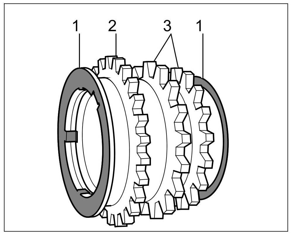 1.2. Place crankshaft bearing shells with lubricating groove and bore -2- into the upper part of the crankcase -1-. Smooth crankshaft bearing shells -3- belong in the lower part of the crankcase. Insert the thrust washers into the centre with grooves facing outwards (affix using multipurpose grease) or alternatively wait until after the crankshaft has been inserted.