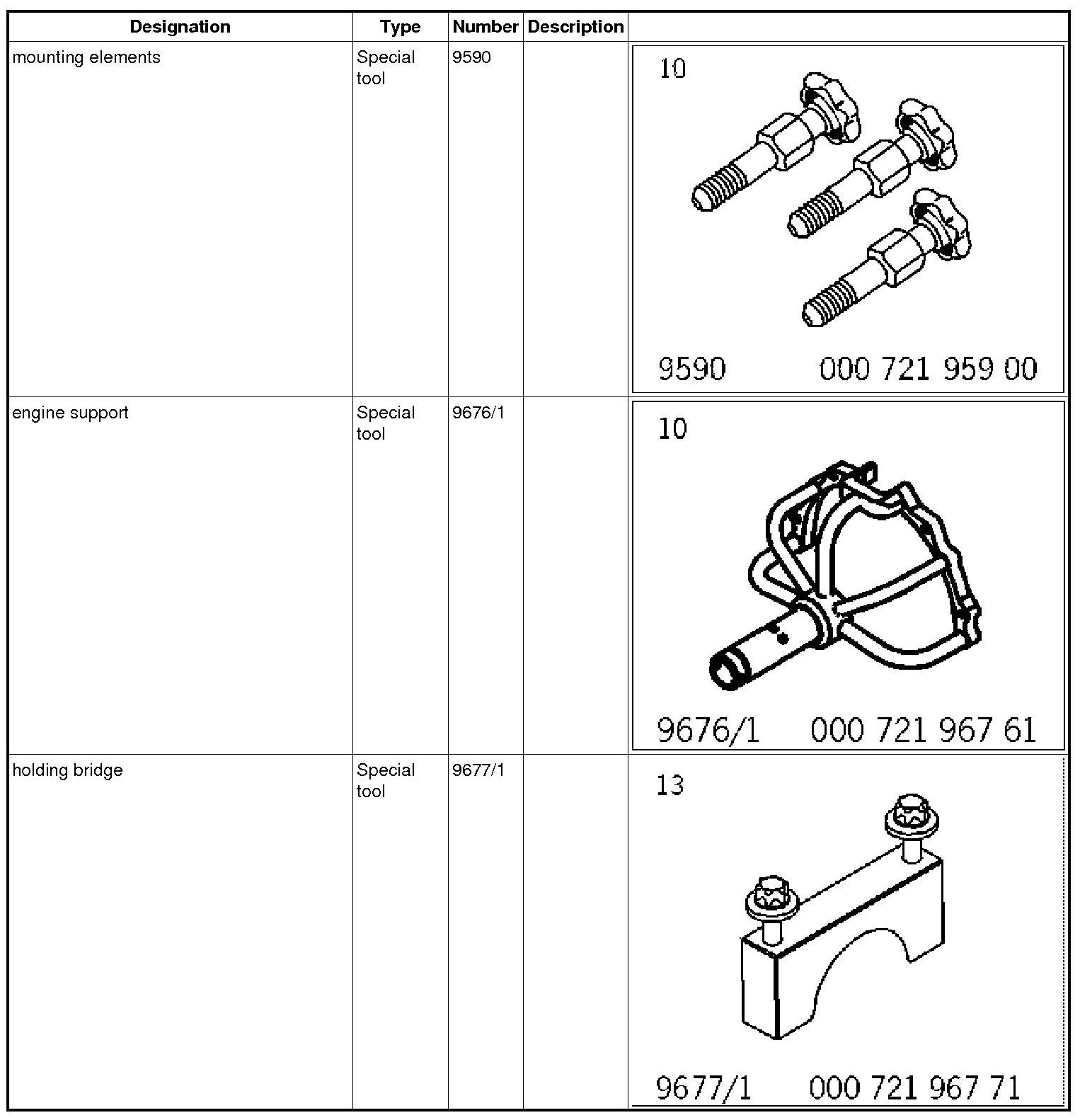 - The upper part of the crankcase together with the engine support engine support 9676/1 is attached to the assembly support. Use the four screws mounting elements 9590 and tighten them. -> 1001IN Securing engine on assembly support (mounting bracket) 1001IN Securing engine on assembly support (mounting bracket)