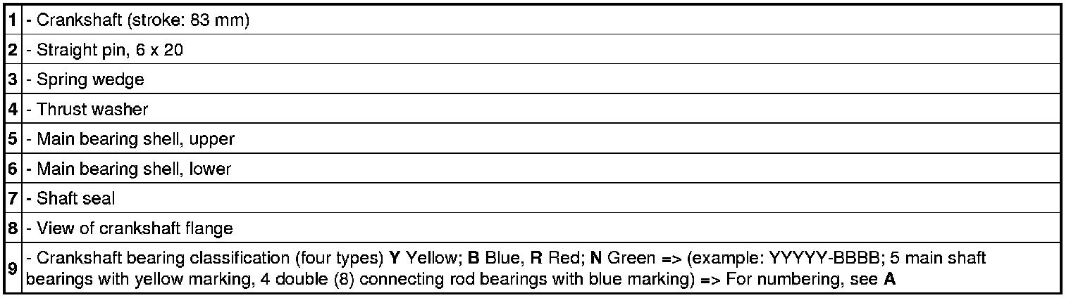 1.1. Select crankshaft bearing shell classification based on the inscription on the crankshaft's flywheel flange -9-. Example: YYYYB YYYY mean 5 main shaft bearings and 4 double connecting rod bearings (8 connecting rods in total). The letters are the abbreviations for the colour code of the bearing shells (Y for yellow, B for blue, R for red, N for green). Based on the example above, yellow bearing shells are to be selected for the main shaft bearings 1 to 4 and a blue bearing shell is to be selected for the fifth main shaft bearing. The connecting rod bearing shells should all have a yellow marking in this case.