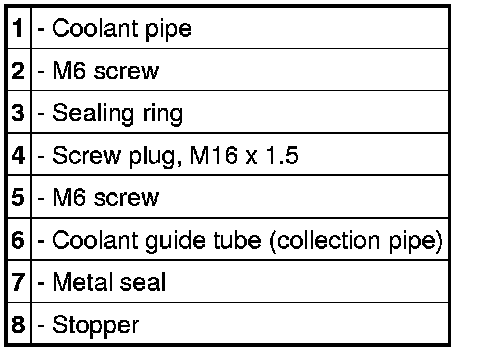 3. Check coolant guide (collection pipe) to make sure that the sealing faces are clean and free of burrs. Fit metal seals at the left and right, screw in screws securely on metal seals by hand. Move coolant guide at the upper part of the crankcase into installation position and fit it.