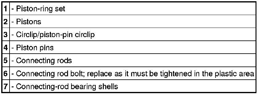 6. Pre-fit all pistons with connecting rods and piston rings, number by cylinder and place to one side. For details, see -> 131037 Disassembling and assembling pistons 131037 Disassembling and assembling pistons